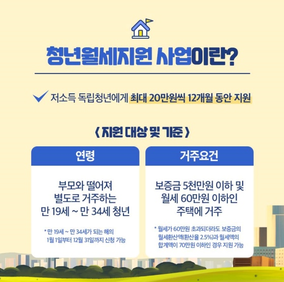 지원 대상은 만 19세~34세 청년으로 부모님과 떨어져 별도로 거주하는 무주택 청년입니다. 만 19세~34세가 되는 해의 1월 1일부터 신청하여 지원받을 수 있으며, 기혼자 또는 미혼자 모두 신청 대상에 해당합니다. 또한 보증금 5000만원 이하, 월세 60만원 이하인 주택에 거주하는 경우에는 최대 20만원의 월세를 12개월 동안 지원받을 수 있습니다.