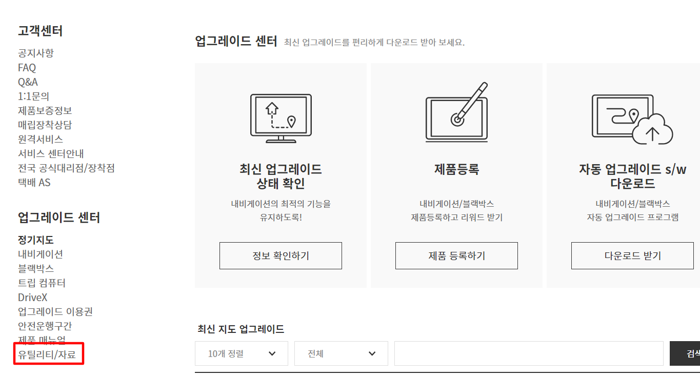 아이나비 내이게이션에 필요한 유틸리티나 드라이버도 해당 홈페이지에서 무료로 다운로드할 수 있는데요. 화면 왼쪽 항목에서 '업그레이드 센터'에 '유틸리티/자료' 항목을 클릭합니다.