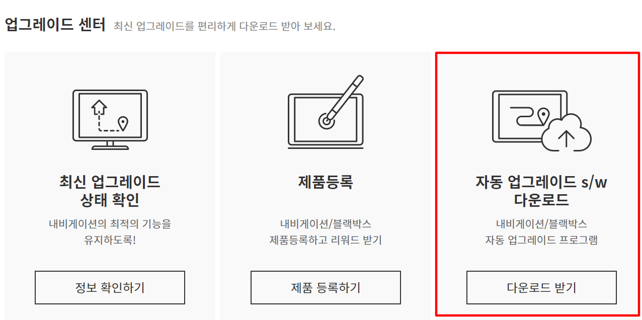 아이나비 홈페이지에 접속하게 되면 화면 아래쪽에 '업그레이드 센터' 에서 최신 업그레이드를 편리하게 다운로드 받을 수 있는 서비스를 제공합니다. 해당 서비스는 '최신 업그레이드 상태 확인' 으로 내비게이션을 최적의 기능으로 유지시키고 '제품등록' 으로 내비게이션과 블랙박스 제품등록을, '자동 업그레이드 소프트웨어 다운로드'로 내비게이션과 블랙박스를 자동 업 업그레이드 프로그램을 다운로드 받을 수 있습니다.