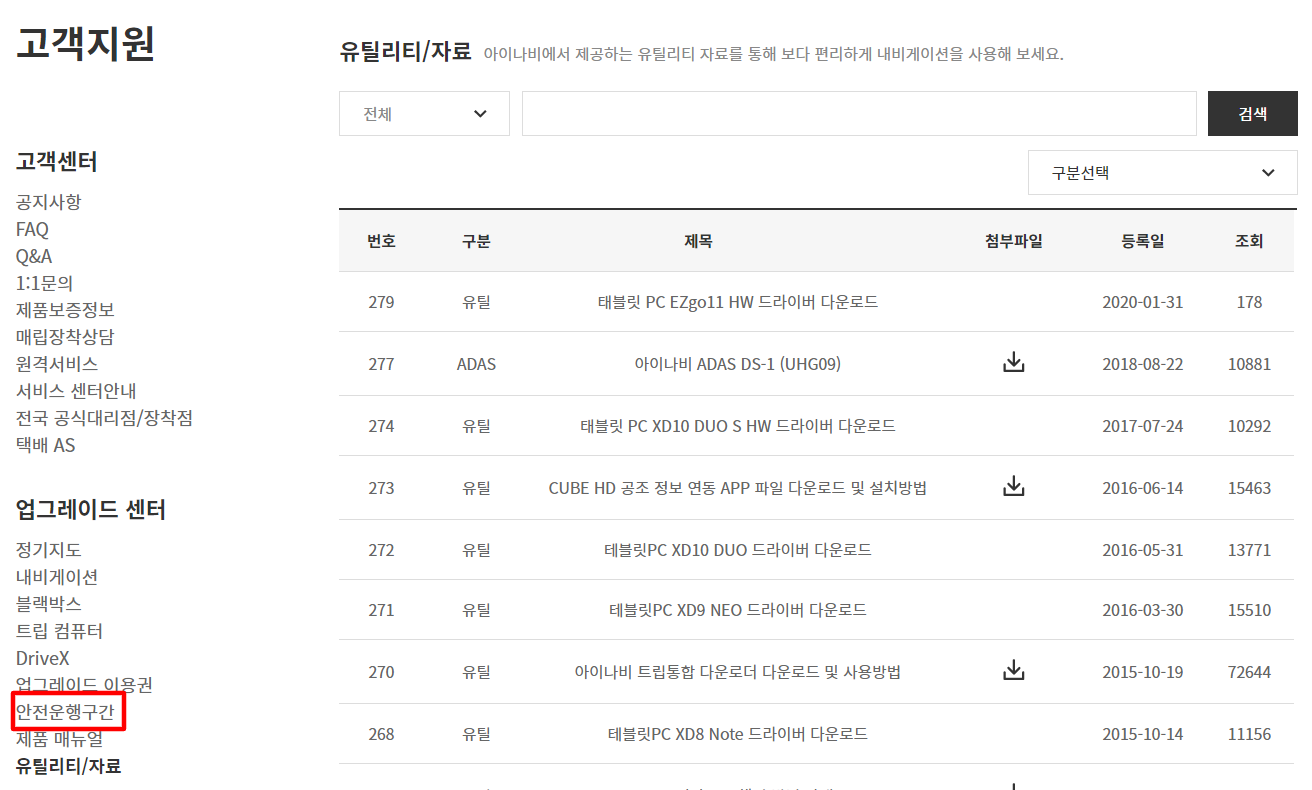 유틸리티 자료와 마찬가지로 왼쪽 화면 '업그레이드 센터'에서 '안전운행구간' 항목을 선택합니다.
