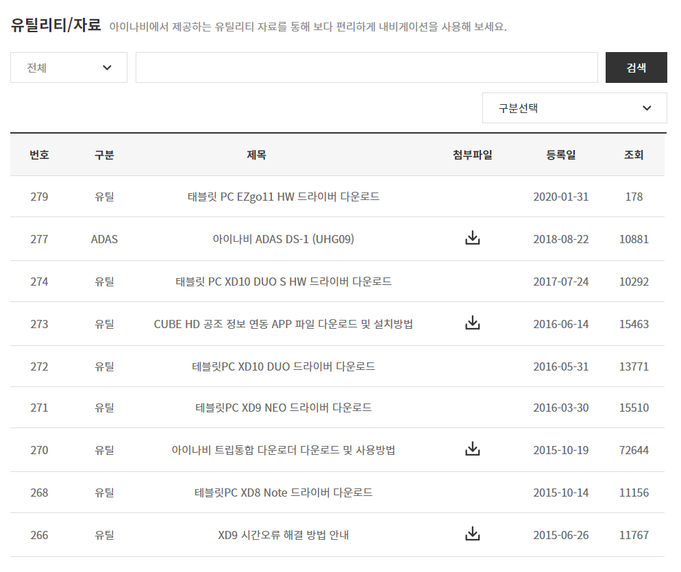 '유틸리티/자료' 에서는 아이나비와 관련된 다양한 제품들의 유틸리티 드라이버를 무료로 이용할 수 있습니다. 위 사진과 같이 태블릿PC 등 여러 제품의 드라이버 다운로드를 통해 아이나비 제품에 나타나는 문제들을 해결할 수 있습니다. 아이나비 제품 드라이버에 문제가 있으신 분들은 아이나비 유틸리티/자료 서비스에서 제공하는 유틸리티를 이용해보시기 바랍니다.